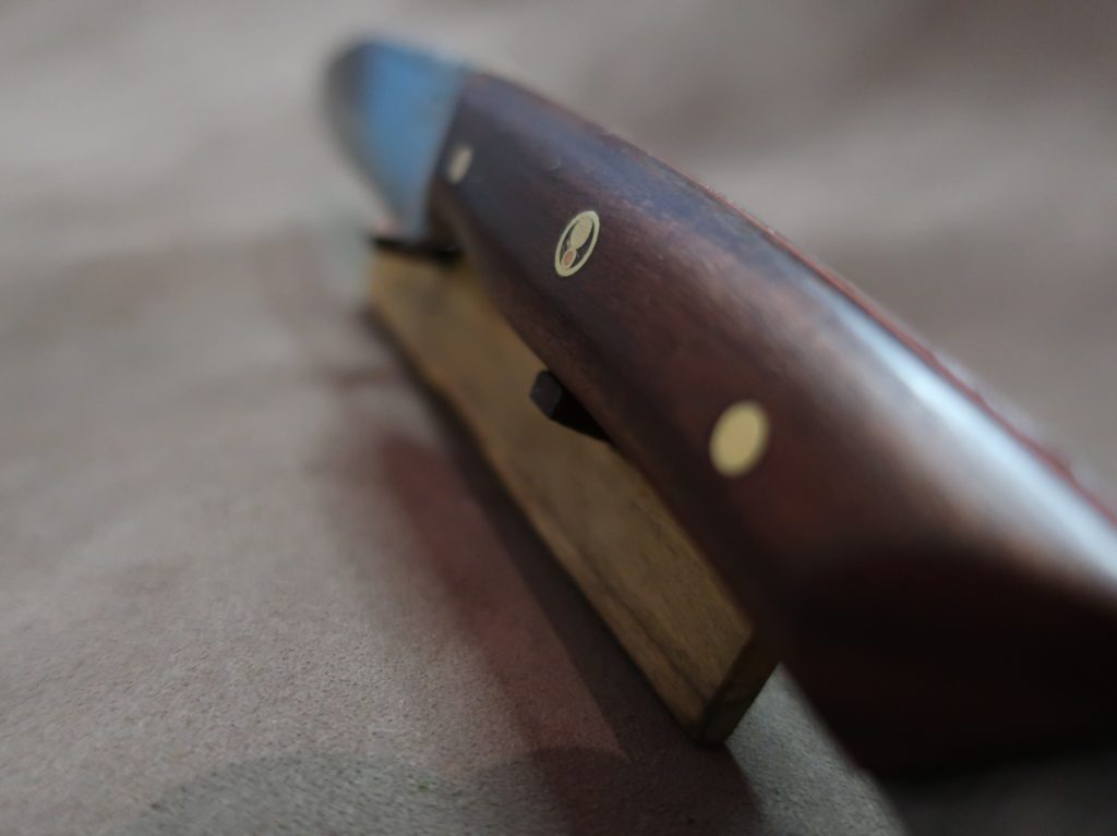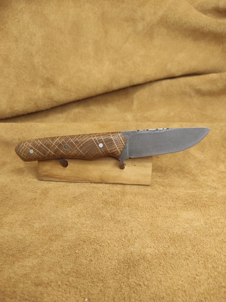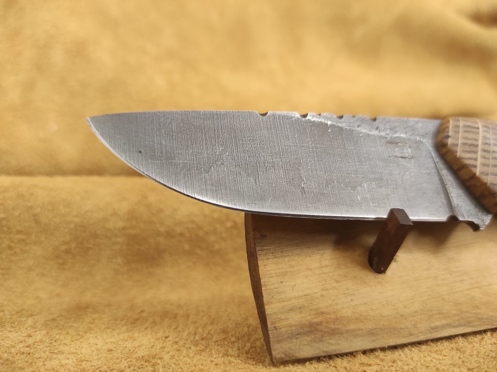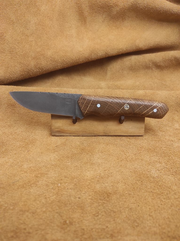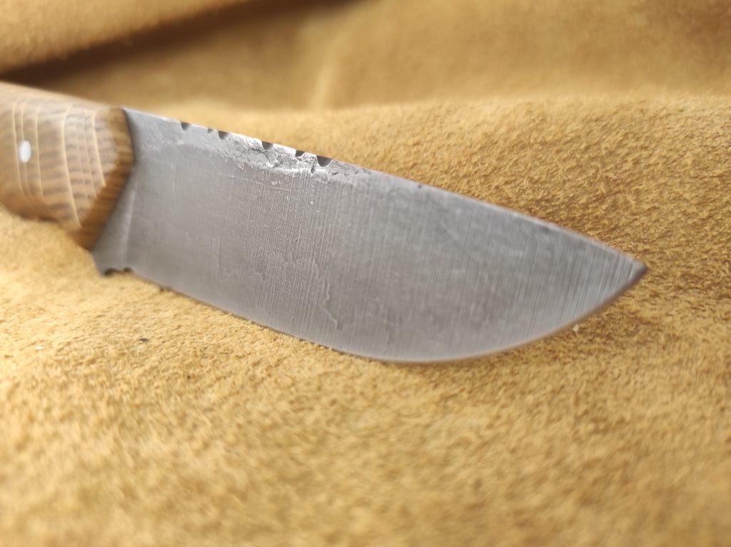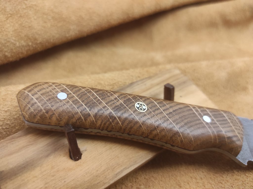 Sa lame drop point de 8 cm, pour une hauteur de 2,8 cm et une épaisseur de 2,5 mm, est forgée dans un acier 135Cr3. Cet acier à haute teneur en carbone assure un tranchant remarquable, une excellente résistance à l’usure, tout en restant facile à aiguiser. Grâce à une émouture plate partielle et une finition satinée mate, la lame combine précision, solidité et esthétisme discret. De plus, un traitement thermique minutieux avec recuit sélectif garantit la résilience et la longévité de la lame.
